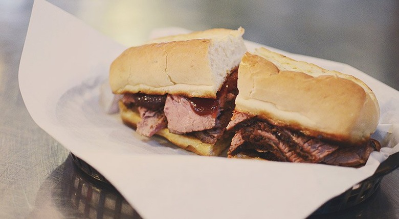 The thick-sliced tri-tip on this packed sandwich is cooked in its own juices for hours, then quickly seared to get that smoky char. As for the bread, think French dip roll, but instead of soaking up beef drippings, it's griddled with garlic butter and slowly absorbs the SLO favorite's signature BBQ sauce.