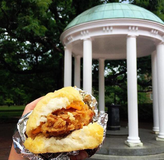 It's hard to say which one is more iconic of a Chapel Hill education: the Old Well or a chicken cheddar biscuit from the 24/7 Southern food haven. The pro move is to clearly combine the two—that way, when you get thirsty, you have a water fountain at your disposal.