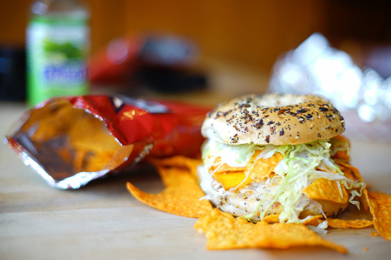 You know that feeling of sadness once your sandwich is over and all that remains are unsalvageable crumbs? Well, that will never hit when you pair the Crunch 'N Munch, a Dorito-packed turkey bagel sandwich, with a bag of Doritos. Call them insurance chips.