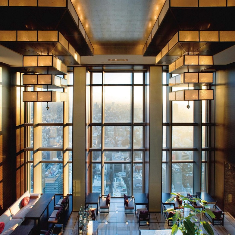 Check-in begins on the 38th floor, a dramatic two-story space with floor-to-ceiling windows on either side. An east-facing view peers over Tokyo's oldest neighborhoods, and a west-facing one frames the opposite, including Shibuya, one of the city's most vibrant and modern shopping districts.
