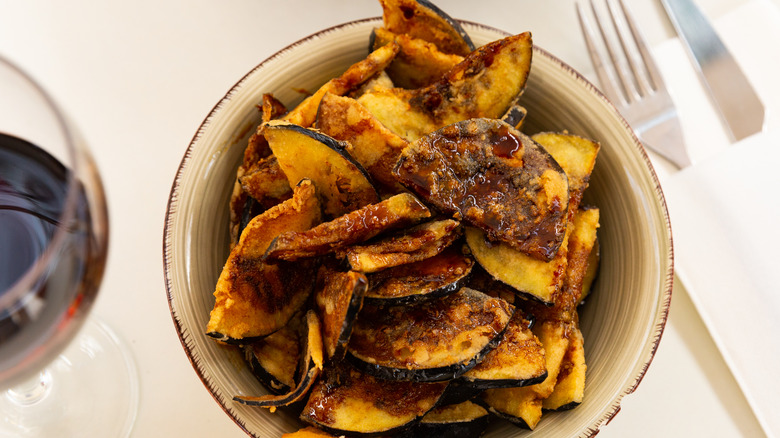 Many traditional tapas dishes contain meat or seafood, but there are a few classic vegetarian options like this eggplant and honey dish. Taste Atlas associates the origin of the dish with Moorish influence, which can be seen in both the choice of eggplant and the addition of sesame seeds sprinkled the top of the battered and fried slices. The dish is well-liked in Andalucía — specifically, Córdoba, where it's served with thick molasses called miel de caña.