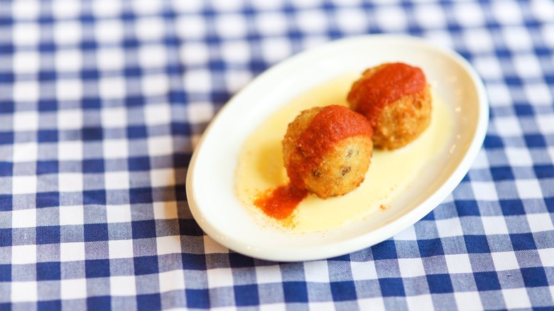 Many countries have meatball traditions, from Sweden's gravy-topped Swedish meatballs to Italy's classic spaghetti with meatballs. Travel Curious puts albondigas' Spanish origin during Muslim rule, with the name coming from the Arabic "al-bunduq" (meaning hazelnut, or a word used to describe a small, round object). Spanish conquistadors took the dish to the New World, bringing albondigas to Latin America. The original Moorish albondigas were made with lamb, but Spanish versions are typically made with pork and beef. At a tapas bar, you'll find small meatballs swimming in a spicy, smoky tomato sauce, hence the "en salsa" part of the name.