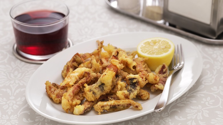 Fried calamari is typically associated with Italian cuisine, but the dish is enjoyed throughout the Mediterranean (including Spain). This tapa translates to "fried squid," although it may be called something slightly different depending on the region. According to Barcelona Experience, it's often called calamares a la romana when squid rings are deep-fried and served with lemon. You'll recognize this dish as being similar to the ones on the appetizer menu in American restaurants. In the south, you'll find calamres a la andaluza, which includes squid rings and some small squid, while Barcelona calls it chipirones, and the plate is entirely composed of whole baby squid.