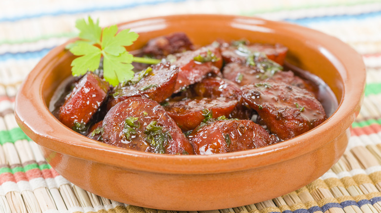 Spain is well-known for chorizo, but it wasn't always a bright red sausage. According to Great British Chefs, Spaniards would slaughter their pigs in November and cure the meat to last the long winter ahead. Chorizo was the result of all the scraps, trimmings, and off-cuts that remained, finely minced and stuffed into a "short piece of gut." When smoked paprika came to Spain in the 16th century, chorizo was transformed into the red-hued sausage we know today. These garlicky, smoky sausages are sliced into bite-sized pieces and simmered in red wine for a tapa that's served all over Spain.