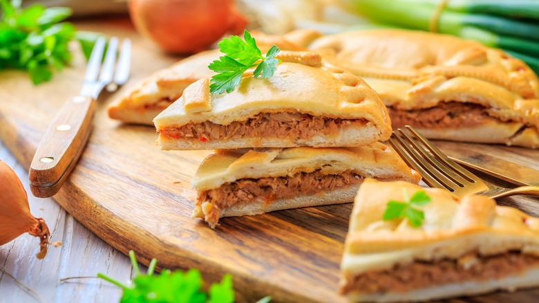 Empanadas are typically associated with Latin America, but the history of empanadas has its roots in Spain. The first traces of the word "empanada" was found in a 1520 Spanish cookbook, and the dish is thought to have originated in Galicia. Here, empanadas are full-sized pies cut into slices, but they can be found as hand pies in other regions of Spain (via Go! Go! España). You'll find them stuffed with a variety of fillings, although the most traditional are gallega (tuna and sofrito), batallón (spicy potato and chard), or Menorca (pork, onions, and saffron).