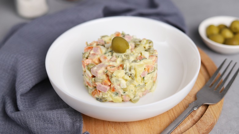 It might seem strange that a classic tapa would be called the "little Russian salad," but Spanish Sabores says the dish is as Spanish as it gets. In fact, the dish was briefly renamed Ensaladilla Nacional and proclaimed the national dish of Spain at the end of the Spanish Civil War. The tapa was invented in Moscow by Belgian chef Lucien Olivier, where it was composed of expensive ingredients like caviar. The Spanish version is much simpler, made by combining mayonnaise with vegetables like potatoes, carrots, and peas. Depending on the region, it may contain boiled eggs, canned tuna, or chopped shrimp.