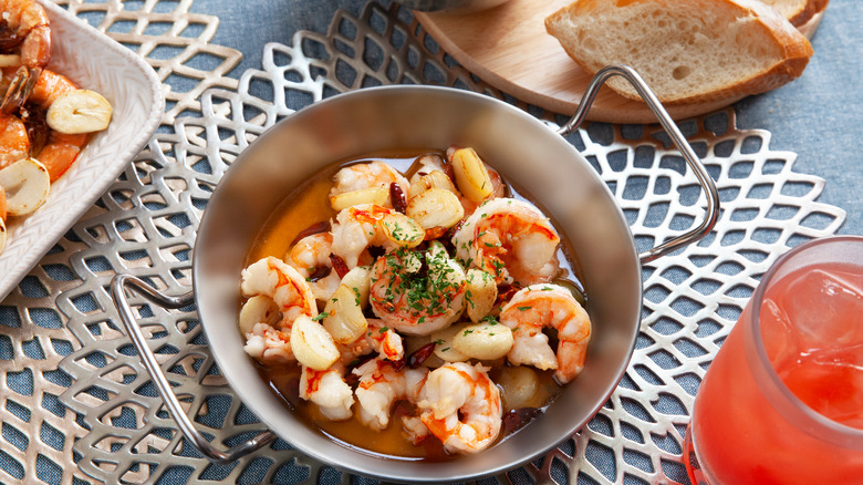 Translated to "garlic shrimp" in English, this classic tapas dish is popular in central Spain and coastal regions where seafood is abundant. Taste Atlas describes the dish as shrimp sautéed in garlic, lemon juice, paprika, and olive oil before being topped with fresh chopped parsley. While it can be served as a main dish, it's more typically enjoyed as a tapa alongside bread. The bread is an important component because the sauce is as good as the shrimp, so don't forget to mop it up before sending the plate back!
