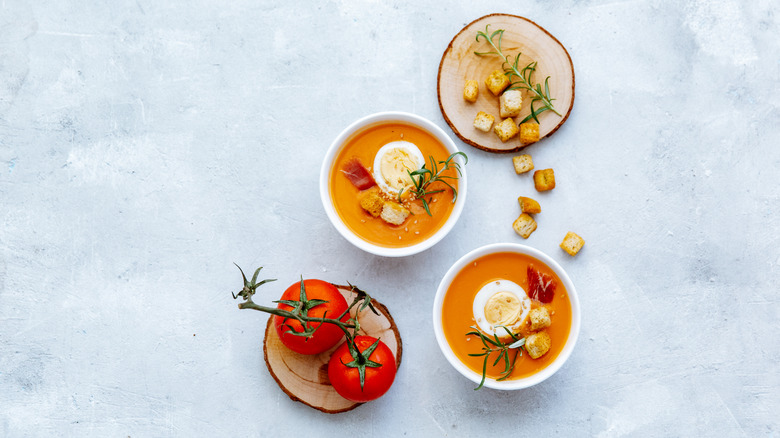 During Spain's hot summer days, there's no better choice than reaching for a bowl of gazpacho, a cold soup typically served as a tapa or first course. Gazpacho is made by blending a variety of fresh vegetables, most typically tomatoes, cucumbers, and peppers. According to the Andalucia.com website, gazpacho hails back to Roman legions, who made the dish on the road. You'll find regional variations all over Spain, from red gazpacho garnished with eggs or ham to white gazpacho made with garlic and almonds and green gazpacho made with chopped herbs.
