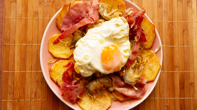 This tapa roughly translates to "broken eggs" and features eggs cooked in olive oil and served over fried potatoes. Depending on the restaurant, the dish may also include jamón, chorizo, or bits of fish. According to the Culture Trip, some of the best huevos rotos can be found in Madrid, but the tapa may have originated in the Canary Islands in the early 1800s. It comes from humble origins as a way to use leftover scraps of meat or fish that were served with inexpensive stable foods (potatoes and eggs).
