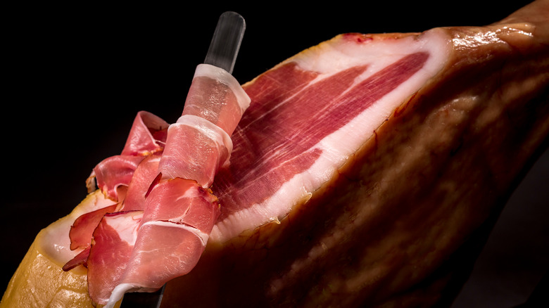 Spain takes their ham seriously: Jamón is typically carved to order and sliced so thinly that it basically melts in your mouth as you eat it. According to National Geographic, true jamón ibérico is protected with a Denominación de Origen status, guaranteeing that it comes from pata negra Iberian pigs raised in the dehesa pastures of four southwestern Spanish regions (Guijuelo, Huelva, Les Pedroches, and Extremadura). This ham is served at high-end restaurants and tapa bars, but you'll also run into jamón serrano — still delicious, but made from cerdos blancos pigs in the mountainous regions (via Mercado Little Spain).