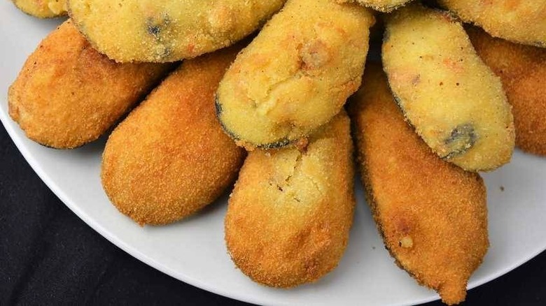 You'll find croquetas all over Spain, but this tapa is a bit unique: It's a croquette made inside a mussel shell. Chef H. Delgado says they're called "tigres" because they're spicy. The dish can be found in Galicia, the Basque Country, Valencia, and Madrid. In Bilbao, the breaded and fried mussels are served with a spicy tomato and anchovy sauce, and the shells are often discarded onto the floor (via Taste Atlas). If you're in Galicia, this dish will likely be called mejillones rellenos (stuffed mussels) instead of mejillones tigres.