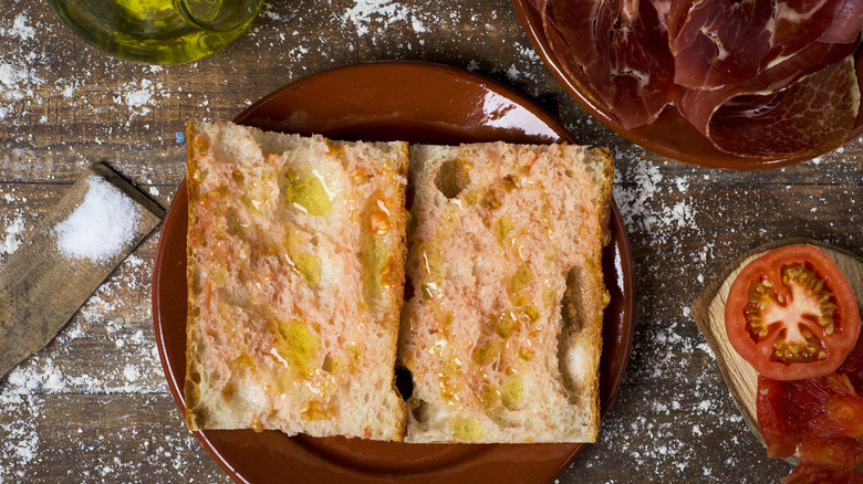 This dish might not sound like much — bread with tomato — but pan con tomate is an integral part of Spanish culture. The Foodolic dates the dish back to the 16th century when dried bread was rubbed with raw tomatoes to give it new life. In most of Spain, it's prepared by grating a tomato until it turns into a pulp, which is scooped onto toasted bread with olive oil, salt, and sometimes garlic. In Catalonia, the dish is called pa amb tomàquet and it's made a little differently: The toast is simply rubbed with a thick-skinned tomato instead of using the pulp.