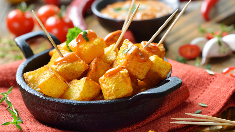 When Spanish conquistadors brought the potato from the Incan empire to Spain in the 16th century, they undoubtedly had no idea it would become the inspiration for one of the most famous tapas (via Foodicles). Papas bravas originated in Madrid, where it was made by frying chunks of potatoes and tossing them in a spicy tomato sauce. Depending on the region of Spain, you may find this dish topped with aioli, or the sauce may be infused with vinegar or paprika. Regional dialects also determine whether it's called "papas" or "patatas" bravas, too.