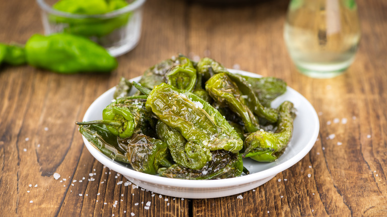 This dish has also been called roulette peppers because you're playing a game while enjoying this tapa. Atlas Obsuro tells of a Spanish saying that goes "los pimientos de Padrón, unos pican y otros no," which roughly translates to "some Padrón peppers are spicy and others are not." Roughly one in 10 chiles is as spicy as a jalapeño, and there's no way to know before taking a bite. Luckily, Spanish tapas are served with beer or wine, so you'll have a beverage close at hand in case you get the misfortune of burning your tastebuds.