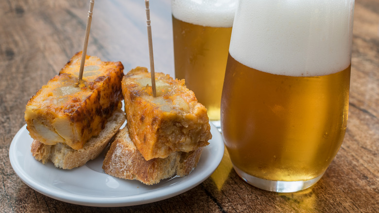 One of the most well-known Spanish tapas is made from a few simple ingredients: eggs, potatoes, onions, and a little oil. Unlike the tortillas made in Central and South America, the Spanish tortilla is more of a frittata than a wrap. According to NPR, the omelet is enjoyed for breakfast, lunch, dinner, or — you called it — tapas, when it's sliced into bite-sized portions and skewered with a toothpick for easy eating. While the dish originated in Extremadura, you'll find tortilla española in all corners of Spain (via Queen Sofía Spanish Institute).