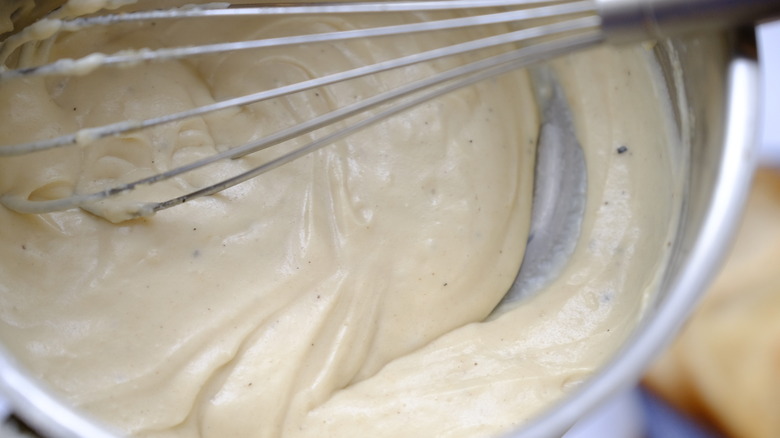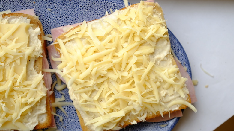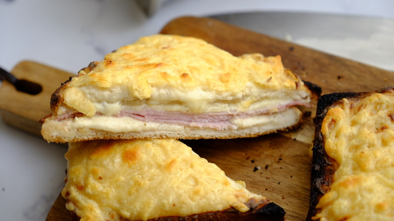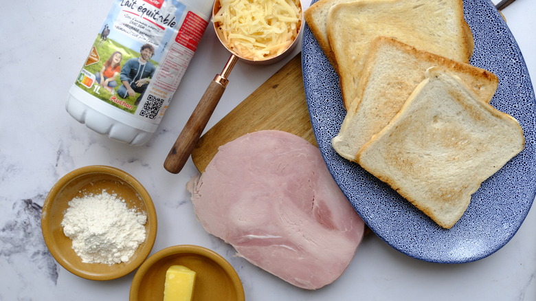 To make a croque monsieur, you'll typically be using white bread. You'll also need ham –- if you're using the thin-sliced deli kind as Ngo does, you'll need about two slices per sandwich. Ngo favors Gruyère cheese for this preparation and tells us, "Comté and Gruyère cheese are the most common cheeses used for croque monsieur." However, he adds that "You could make [a] croque monsieur with any hard [or] semi-hard cheeses that melt well, such as mozzarella." He also tells us, "The amount of cheese is very flexible; it really comes down to personal preference." Ngo likes to top his croque monsieur sandwich with béchamel sauce to give it some additional flavor. This sauce, one of the staples of French cooking, is made with milk (he favors whole milk), butter, and flour.