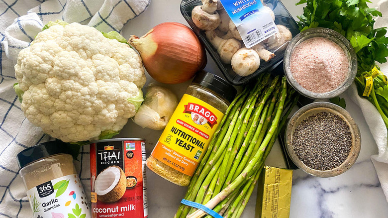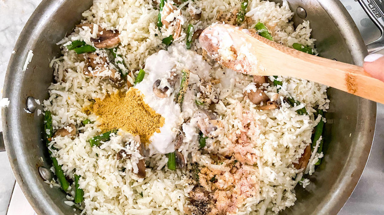 After adding in the cauliflower, stir in the coconut milk, garlic granules, salt, pepper, and the nutritional yeast. Dairy-free and vegan, "nutritional yeast is a really good ingredient when you want a light cheesy flavor with some nutrition," Hahn explains to Tasting Table. "It is a deactivated yeast full of B vitamins and protein." Of course, if you want to swap it out for Parmesan cheese, that's fine too, according to Hahn. Whichever you're using, reduce the heat to medium-low for 2 minutes and let the contents warm through. If at any time, you feel the mixture is a little dry, add some more coconut milk to simmer.