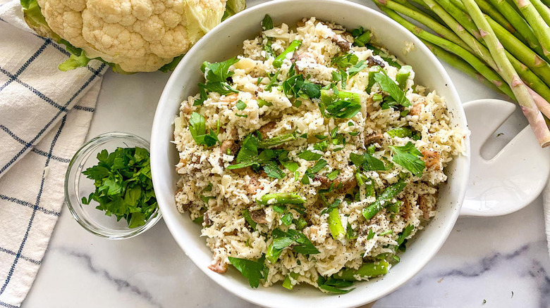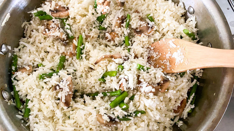 Risotto is one of the world's most satisfying comfort foods. Creamy and spoonable but with a satisfying bite, it's the perfect backdrop for just about anything. But today, we've got our sights set on fresh asparagus spears and umami-rich mushrooms. Thanks to recipe developer and wellness coach Miriam Hahn, we're going to up the veggie count by using cauliflower rather than arborio rice. Hahn's recipe for cauliflower rice risotto not only transforms cauliflower rice seamlessly into risotto, but it also cuts down on your cooking time. As Hahn explains, cauliflower rice doesn't need as much time to break down as grain-based rice.