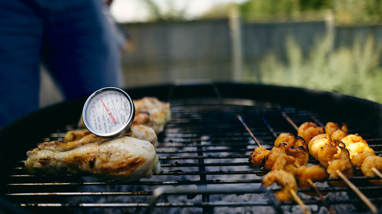 When taking the internal temperature of the chicken, you need to keep several things in mind. According to The Spruce Eats, there are a couple of different temperatures you need to look for to make sure different parts of the chicken are done. White meat should reach and hold a temperature of 150 degrees Fahrenheit for a minimum of three minutes while dark meat should do the same at 175 degrees. But to get an accurate reading, you need to make sure the meat thermometer is inserted into the thickest part of both the breast and the thigh to ensure the chicken is actually cooked through at these temperatures.