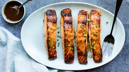 - Serve the salmon with the reserved sauce on the side, and sprinkle it with chopped scallions if desired.