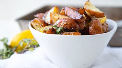 This next step is mainly about juicing the lemons, so grab a large bowl to cut down on the mess. Rinse off your lemons and pat them dry, then roll each one firmly on your counter, which helps release the juice. Shungu likes to use a lemon squeezer but lets us in on the secret that you can easily juice your lemons without special tools. Simply slice them in half and twist a fork into the flesh to squeeze the juice into your bowl. Whisk the lemon juice together with the olive oil, chicken broth, salt, and dried oregano and pour the mixture over the potatoes.