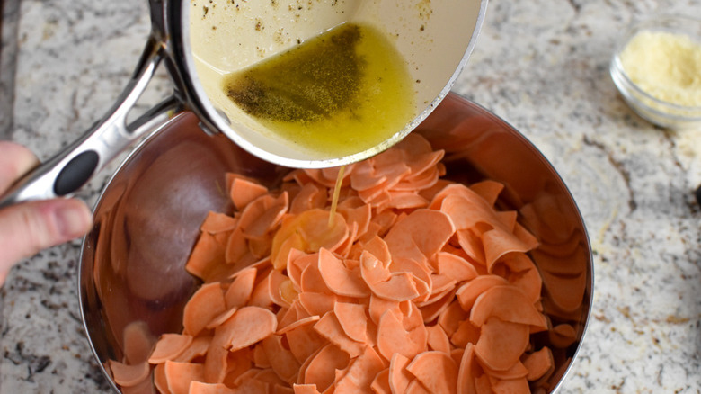- Pour the rest of the butter mixture over the sliced potatoes and toss to make sure they are coated evenly.