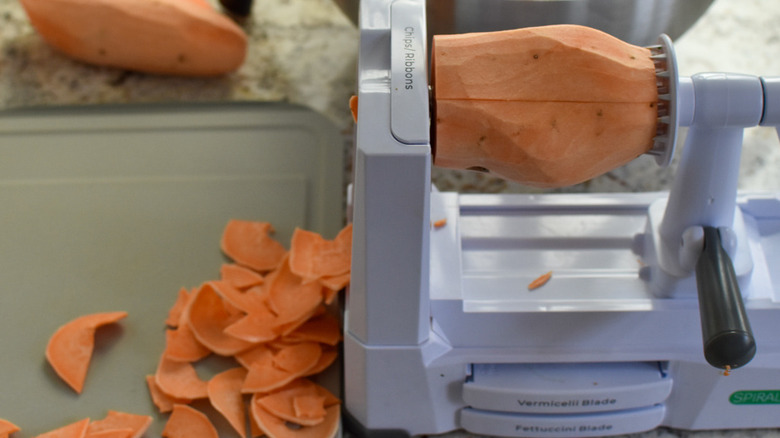 To start things off, go ahead and preheat the oven to 375 F. Next, peel and wash the sweet potatoes, then cut them into slices about 1/16-inch in thickness — so very thin! "I recommend using a mandolin or spiralizer with the 'chip' blade to help with this," says Rapone, adding: "They don't have to be perfect whole discs, but they do need to be a thin, consistent slice." Place the slices in a large bowl.