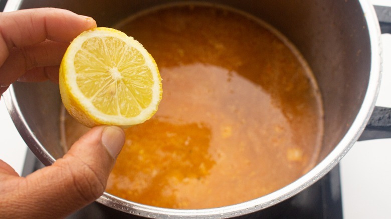 Even though it feels like you've just started cooking, your work in the kitchen is already almost done. Yes, it's true — all you need to do now is add the other ingredients and let the stove work its magic for a bit. So, simply add the red lentils, broth, and lemon juice and zest to the pot. Once you've done that, give everything a good stir, and let it cook on medium-low for about 20 minutes. Feel free to stir the pot every so often, but Olayinka notes that this isn't crucial since the low temperature of the stove means the soup "won't burn."