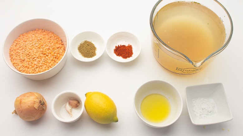 For this soup, you'll need a yellow onion and a couple cloves of garlic — diced and minced, respectively. You'll also need, of course, red lentils, along with olive oil, cumin powder, smoked paprika, salt, chicken broth (you can use vegetable broth if you don't eat meat), and the juice and zest of one lemon, which Olayinka says gives the soup "a fresh taste." If you don't have specifically red lentils, Olayinka says that "any type of lentil will do."
