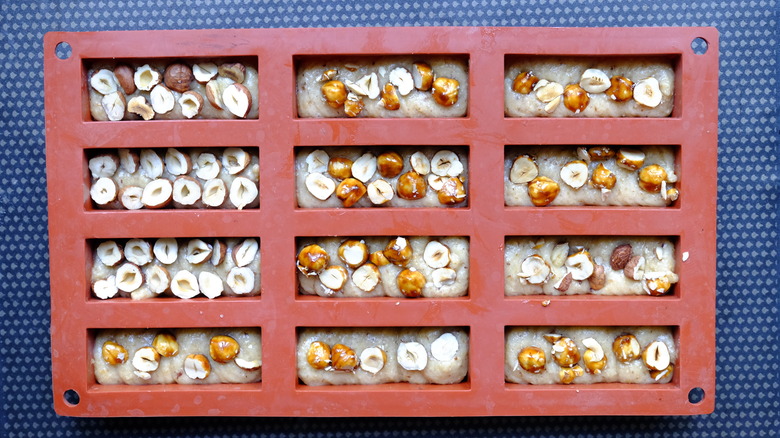 - Fill the financier mold with batter, and decorate each pastry with hazelnut halves.