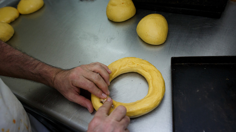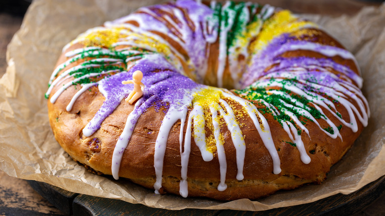 According to Country Living, king cake was a European pastry created to celebrate Three Kings Day, which is the day that Catholics believe the baby Jesus was visited by the three wise men. In the 1870s, the French brought king cake to Louisiana, and it became a traditional part of the Mardi Gras celebration. The circular cake comes with different flavors and fillings but is traditionally made with a cinnamon brioche dough that has a little baby figurine baked into it and is topped with icing and purple, green, and gold sugar. The colors are said to represent justice, faith, and power. Some say the figurine is supposed to be the baby Jesus while others believe it represents prosperity. The lucky recipient of the cake slice with the baby figurine is made "king for the day" and is sometimes designated as the person to bring the king cake to the party next time (via the Caluda's King Cake website).