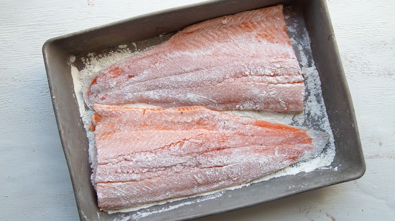 Then, grab a shallow dish and combine the flour, salt, and pepper. Dredge the fillets in the flour mixture on both sides. "Gently shake off any excess flour after dredging the fillets," Shungu says. Set them aside for a moment and move to the next step.
