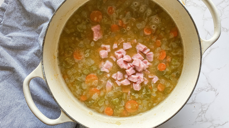 - Add the cubed ham. Bring to a boil and lower to a simmer. Simmer for 10 minutes.