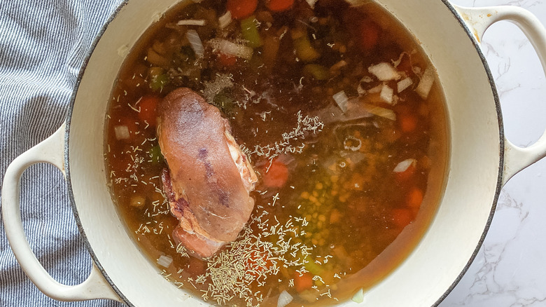 - Add the rosemary, thyme, salt, pepper, and ham hock.