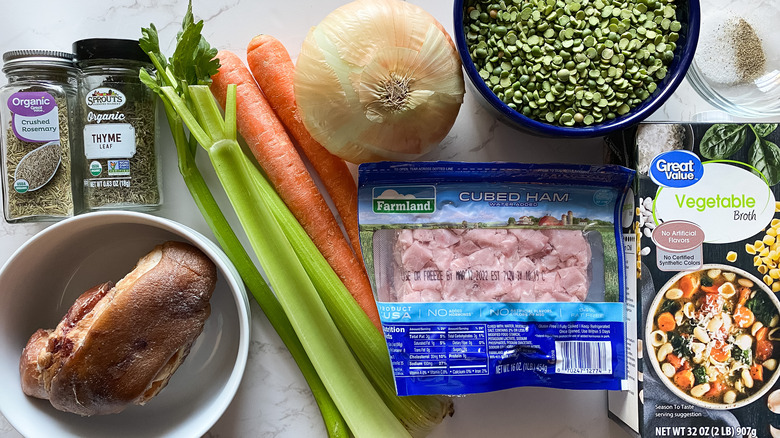 To make this split pea soup, you will need water, onion, carrots, celery, dried split peas, vegetable broth, crushed rosemary, dried thyme, salt, pepper, a smoked ham hock, and cubed ham. Carli notes that the "ham hock is used for adding smoky, hearty, and rich flavor to this soup, while the cubed ham in the final dish provides some protein and substance to this soup." We love the idea of using a ham hock to enhance the soup flavor. Most grocery stores will sell ham hocks near the meat section.