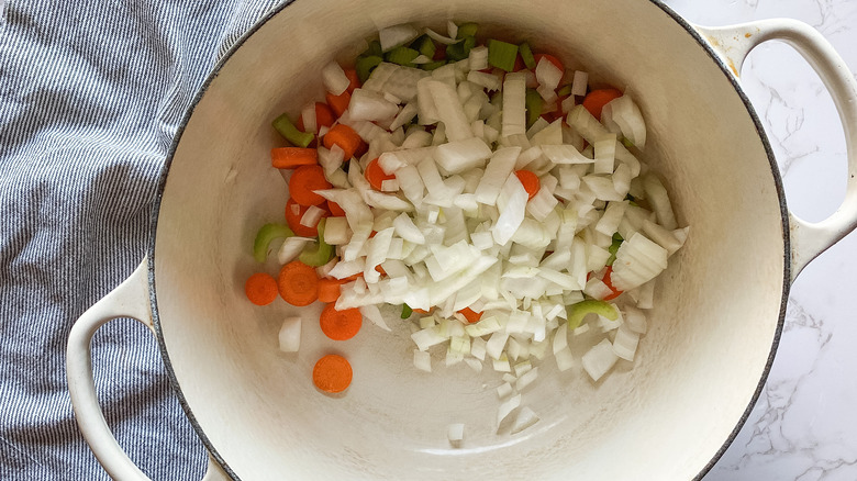 In a large stock pot over medium heat, add two tablespoons of water. To this, add your diced onion, sliced carrot, and diced celery. Carli advises to "use water instead of oil or butter to saute these vegetables, as the flavor of this soup ends up very rich. We can cut out the extra fat, by substituting water for the more typical oil." Carrots, celery, and onion are often used as a base for soup. This combination is often called a mirepoix.