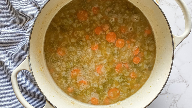 Allow the vegetables to cook and sweat down. When the diced onion becomes translucent, after about five minutes, add the dried split peas, the vegetable broth, and the water. Once these ingredients have been added, give the entire mixture a good stir. Carli recommends "using 4 cups of vegetable broth to 4 cups of water here to ensure a good balance of flavor and liquid to this soup. If desired, you can use all 8 cups of veggie broth if you want a very savory and salty split pea soup."