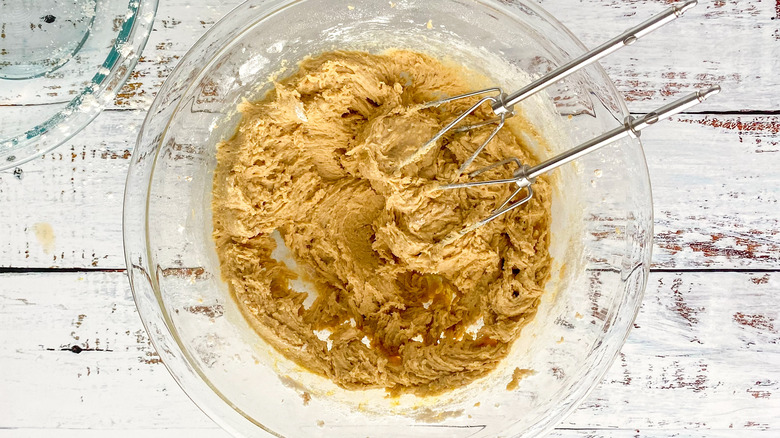 Take out another large bowl and toss in the butter. As a reminder, you should have let it sit at room temperature, making it easier to mix. Then, add the granulated sugar and the brown sugar. Mix the butter and the sugars together until they are light and fluffy. "You can definitely use a standard mixer for this recipe! I use a hand mixer as that's what is [at] my disposal, and then hand fold in the mix-in's so that the dough does not become over-mixed," MacLean shares. "However, if all you have is a whisk and a spatula, this recipe is still definitely do-able!" Next, add the vanilla and the egg and beat until well-mixed. Finally, slowly add the flour mixture until combined.