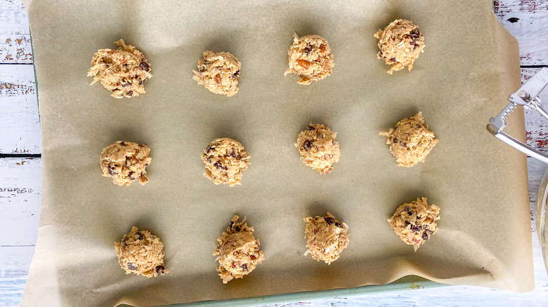 - Using a spoon or scoop, drop 2 tablespoon-sized balls onto the parchment-lined baking sheet, about 2 inches apart.