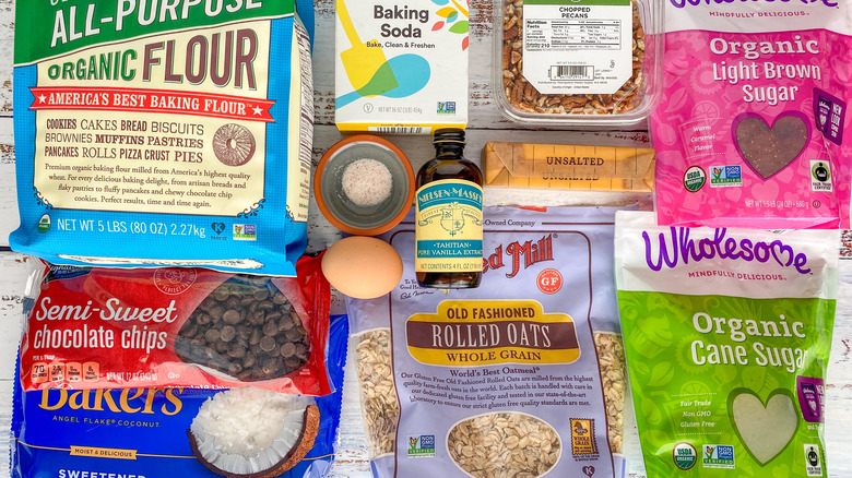 You will also need to grab granulated sugar, light brown sugar, and vanilla extract in the baking aisle. Then, pick up eggs, rolled oats, and sweetened shredded coconut as well. Last but not least, you will need toasted pecans and semi-sweet chocolate chips.