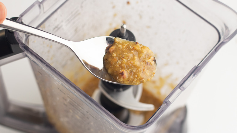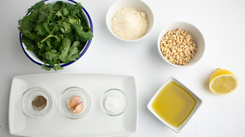 Now, grab the blender and place it in a safe spot on your counter. "Yes, [a] food processor is fine," Olayinka says if you don't have a blender. Open the lid and add in almost all of your ingredients. Start with the extra-virgin olive oil and the toasted pine nuts. Next, toss in the juice of half the lemon, followed by the salt and pepper. You can also add the minced garlic in addition to the Parmesan cheese.