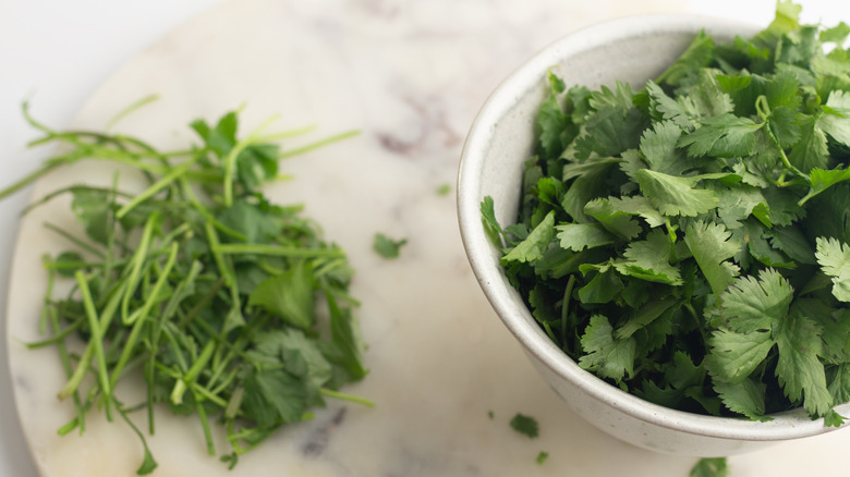 - Pick the cilantro leaves off the stems and set the leaves aside.
