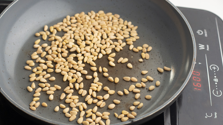 This recipe requires just a little bit of cooking, but it's very simple and takes just 1 minute, to be exact. Grab a pan and your pine nuts. Then, put the pan on the stove and fire the heat up to medium-high. Toast the pine nuts for about 1 minute or so. You don't really need to set a timer for such a short time but rather just keep an eye on the clock. Olayinka notes that the pine nuts "should be browned" — be careful not to burn them!