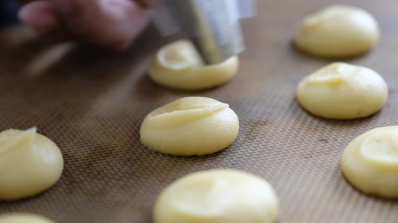 It's time to get out either a nonstick baking tray or a silicone mat. Pipe small gougères on the surface. Please note that if you have small peeks on the cream puffs, you need to smooth them out. You can do so by applying water to your fingers and patting them down a little. Once your gougères are on the tray, preheat the oven to 360 F.