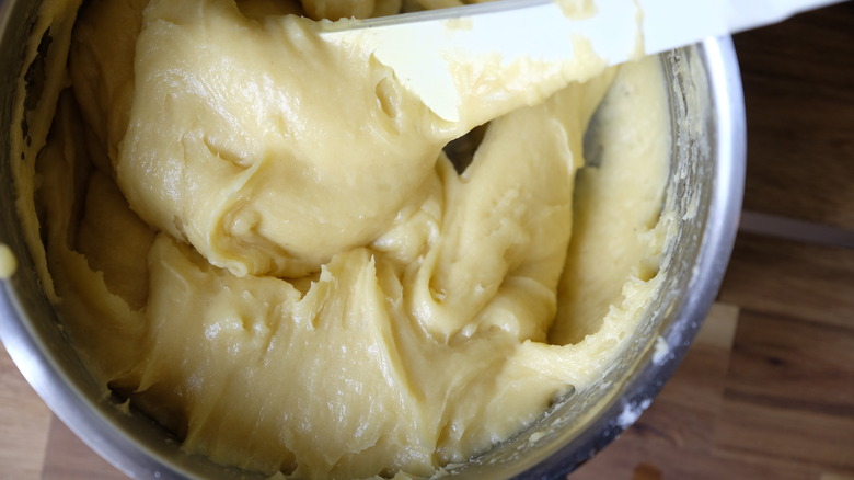 Now, slowly pour the eggs into the "mashed potato" mixture. You should do so in three steps to avoid mixing everything for two long. Add ⅓ of the mixture, then wait until the eggs disappear into the dough before adding another ⅓ of the egg mix. Repeat the steps until all of the eggs are incorporated. You'll know the dough (also known as Pâte à choux) is ready when it's smooth and shiny.