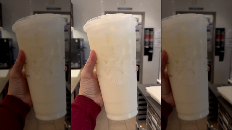 For this secret menu item, order a lemonade and ask for four pumps of white mocha in a venti, three for a grande, and two for a tall. When the barista shakes the lemonade, white mocha syrup, and ice together, it'll all come together well to create a creamy, smooth, but still tart lemonade. If you'd prefer a frozen lemonade, you can also ask for it to be blended up. A strawberry spin on this would be perfect with the addition of some strawberry puree, either shaken up or blended straight into the drink.