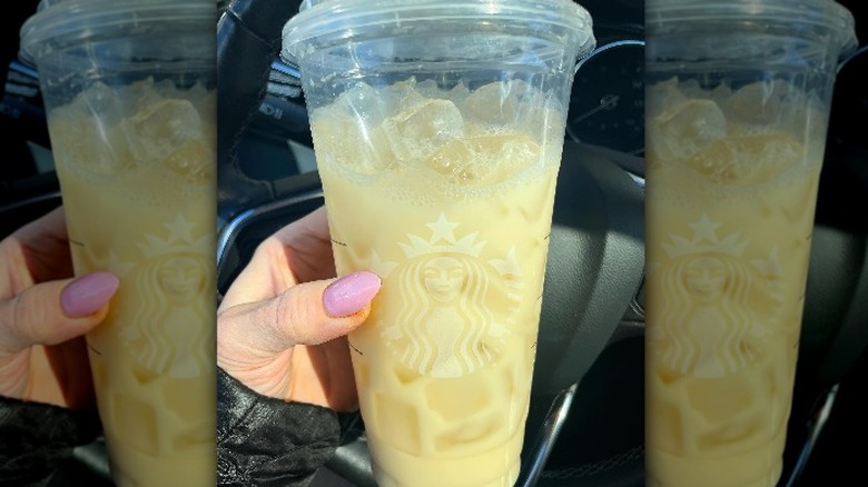 Like the famous Pink Drink and the Lavender Haze, the real magic of Starbucks's Skinny Yellow Drink comes from plant-based milk. In this case, as in the case of the Pink Drink, the addition of coconut is the real magic. For this one, order a venti Iced Green Tea Lemonade, replacing half of the lemonade with coconut milk. For the sweetener, ask for a packet of agave and two packets of stevia. Shaking the whole thing up will help distribute that stevia and agave nicely throughout the drink.