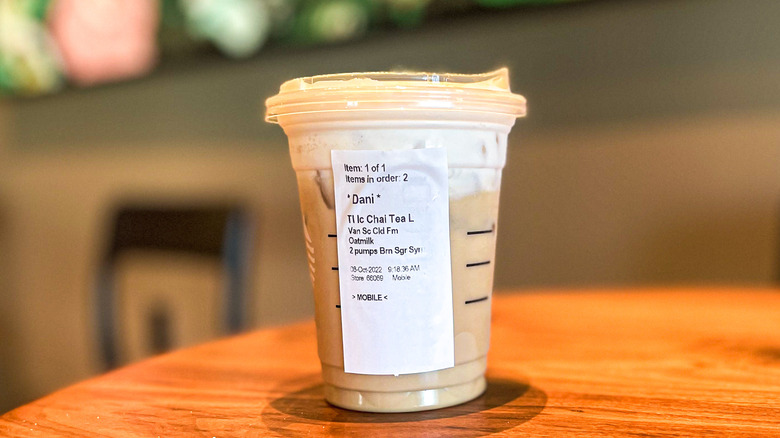 For this one, you'll start by ordering an Iced Chai Tea Latte. You could make an augmented version work with a hot chai, but it would need to miss a key component, so we prefer the iced option. Substitute oat milk in place of the default dairy milk for a smooth texture and a satisfying bit of nuttiness. Then, ask for the brown sugar syrup to be added. We recommend two pumps for tall, three if you're ordering a grande, and then a whopping four for the venti size. Top that whole thing off with Vanilla Sweet Cream Cold Foam. If you're loving a different kind of cold foam, you could also try a different flavor, like the pumpkin cold foam offered during fall.