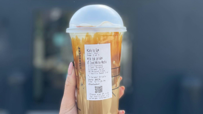 Start by ordering a venti Iced White Chocolate Mocha, but remove the whipped cream. Request that your barista add five pumps of caramel syrup and a hefty drizzle of caramel around the inside of your cup. Then, put Vanilla Sweet Cream Cold Foam on top. We love whipped cream on our mochas, but the cold foam substitution makes this much more smooth and milky. If you're looking for something ultra-sweet, this is it, but if you want to take the sweetness down a little, consider reducing the white mocha a little. After all, you are adding caramel to it, so it's plenty sweet enough.