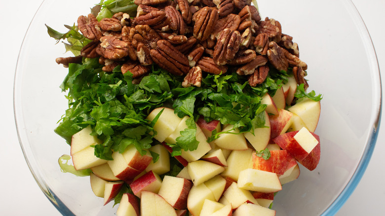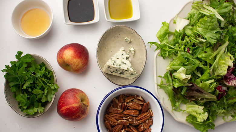 - Add the apples to the salad leaves in the bowl, followed by the pecans and chopped parsley, and crumble the blue cheese with your hands, letting it fall into the bowl as well.
